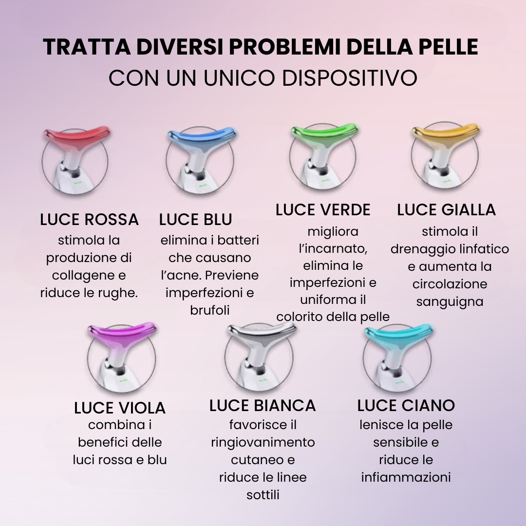 Non è solo un dispositivo, ma un alleato quotidiano che, grazie alle 7 luci LED, al calore e alla vibrazione rilassante, regala luminosità, freschezza e la sensazione di una bellezza ritrovata.